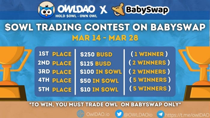 $OWL token is the SafeMoon type of governance token of OwlDAO, and is available on Polygon and BSC Networks. OwlDAO aims to allocate the world’s leading DAO-directed treasury, partner with leading protocols, and build the future of crypto games.
